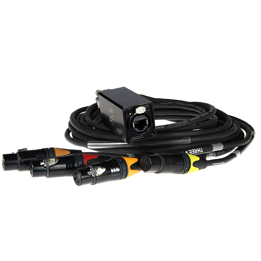 Acting as "Swiss knives" for CAT5 or CAT6 cables, the WidgetLink allows the standard CAT5 and CAT6 cabling to send multiple signals down a single cable thanks to a small range of Break-In, Break-Out and adapters. The use of CAT5/6 cable can be appliet to DMX, Analog Audio, Balanced AES3 Digital Audio, and even hybrid combinations including 10/100 Ethernet. 1, 2, 3 or even 4 discrete signals can be sent down each individual CAT5/6 cable. Shielded cable is required for applications using phantom power, 4 discrete signals, and/or hybrid combinations. Thanks to its low characteristics, CAT5/6 can increase the maximum length in many applications. For example, balanced AES3 signals have a typical distance limit of 100 meters on standard 110 ohm twisted-pair type cable, but can travel up to 300 meters on CAT5/6 cable, depending on the equipment being used. In a hybrid configuration, the maximum distance is dictated by the IEEE 802.3u Fast Ethernet standard. For DMX over CAT5/6 cable, distances of over 500 meters are possible, depending on equipment. Link's Eurocable brand is guaranteed to provide dependable signal integrity using WidgetLink products, particularly when paired with our CVS LKCAT6A STP cable. Other hybrid solutions are also offered with various cable configurations. For example, our CVS LK 1CAT6SF 12/3 cable, which features a 12 AWG / 3 conductor power line with a shielded CAT6 cable for "driveline" type of applications.