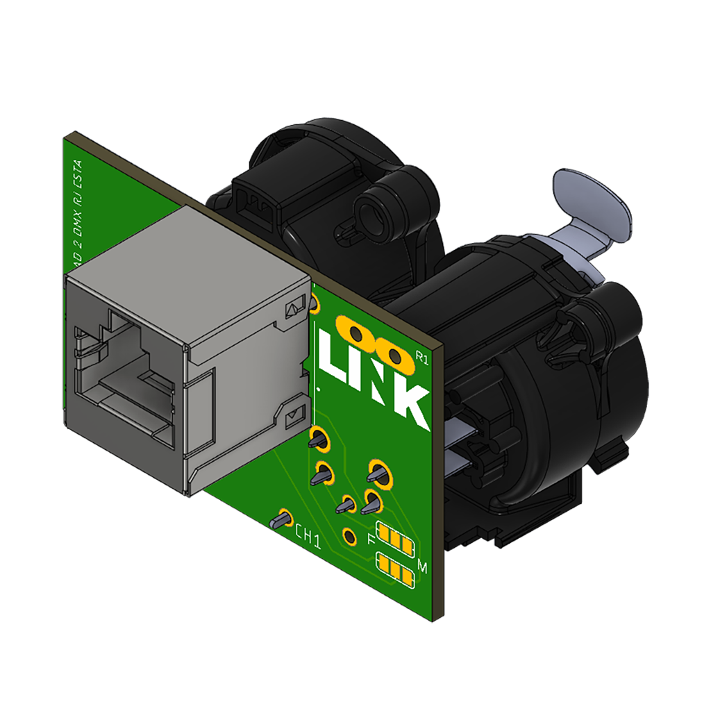Compact DMX interface module featuring 1 NC5 input and 1 NC5 output with 1 Neutrik vertical RJ45 connector on PCB, designed for professional lighting applications. It enables DMX signal transmission over Cat5/6/7 cables (UTP, S/UTP or SF/UTP), providing a reliable and space-efficient solution for structured cabling systems. Fully compliant with USITT/ESTA ANSI E1.11 standards, it ensures signal integrity and compatibility in demanding installations. The compact design allows easy integration into panels and custom enclosures.