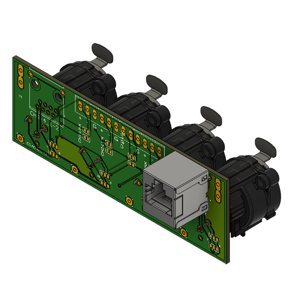 Compact audio interface module featuring 4 XLR inputs (NC3FAV) and 1 Neutrik vertical RJ45 connector on PCB, designed for professional audio applications. It enables audio signal transmission over Cat5/6/7 cables (S/UTP or SF/UTP), providing a reliable and space-efficient solution for structured cabling systems. The robust design and compact form factor (approx. 104 × 35 mm, as shown in the 2D drawing on page 1) allow easy integration into panels and custom installations.